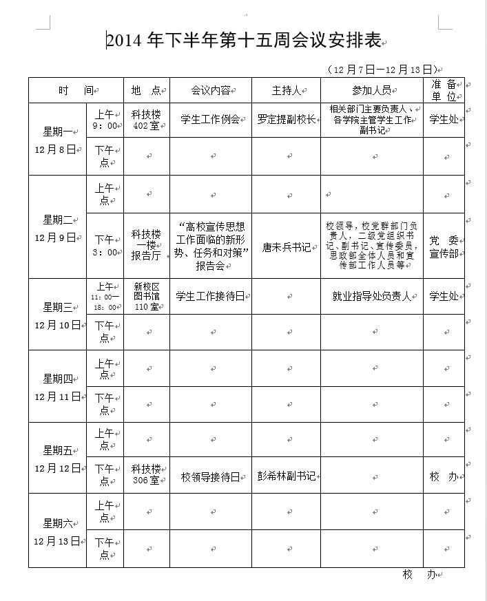2014年下半年第十五周会议安排表