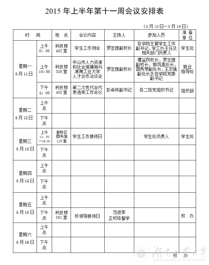 2015年上半年第十一周会议安排表