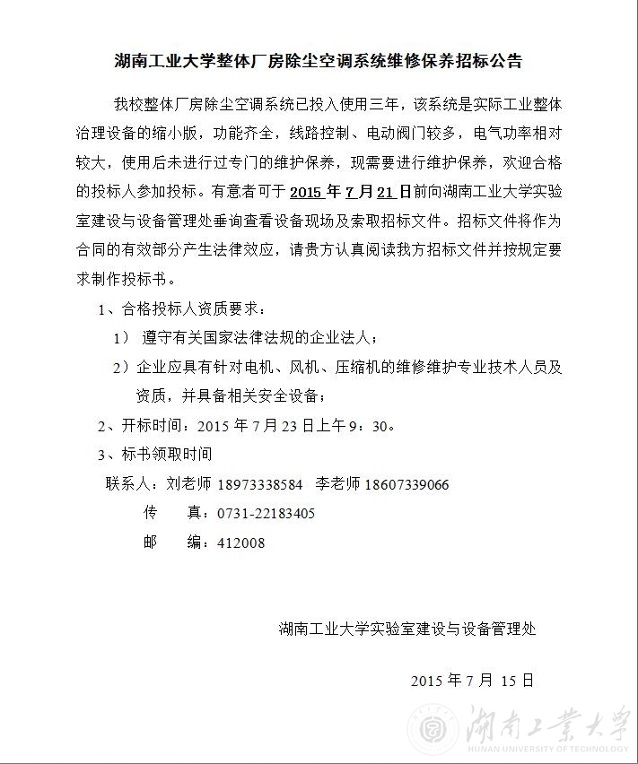 德赢AC米兰官网整体厂房除尘空调系统维修保养招标公告