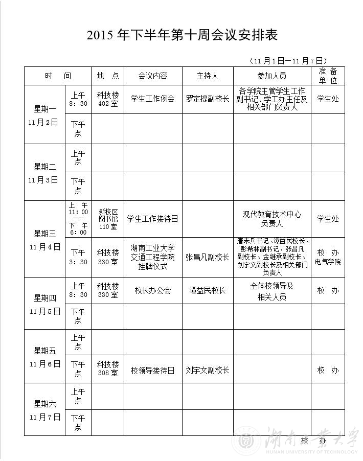 2015年下半年第十周会议安排表