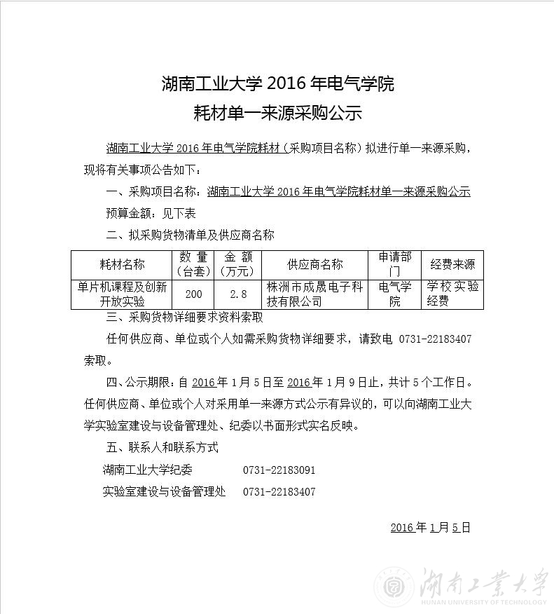 德赢AC米兰官网2016年电气学院耗材单一来源采购公示
