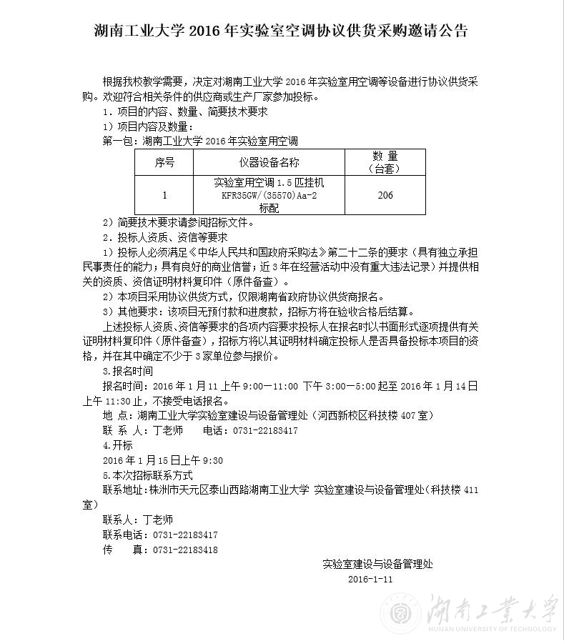 德赢AC米兰官网2016年实验室空调协议供货采购邀请公告