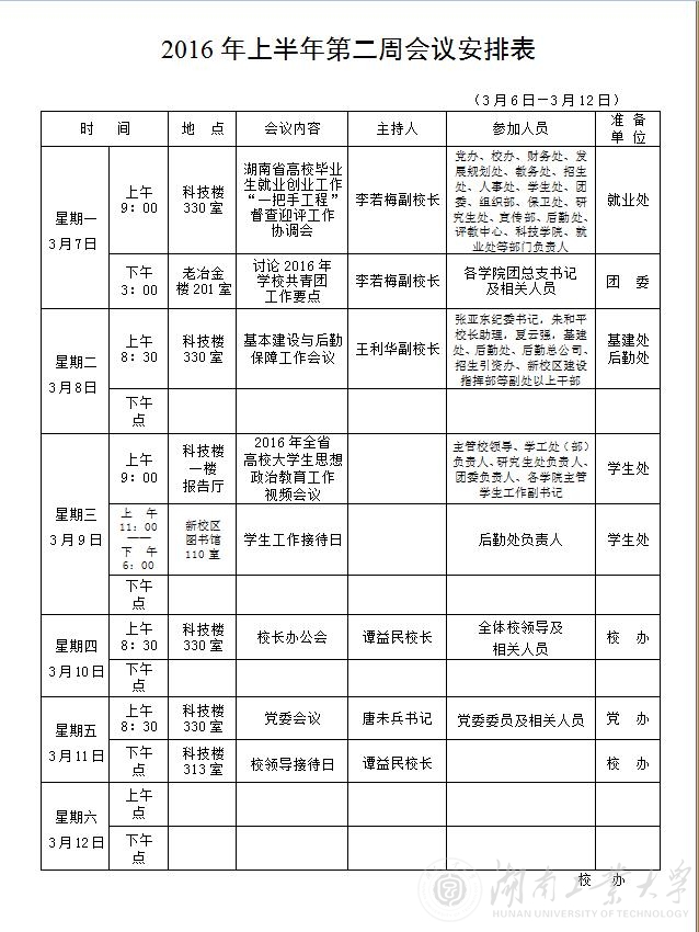 2016年上半年第二周会议安排表