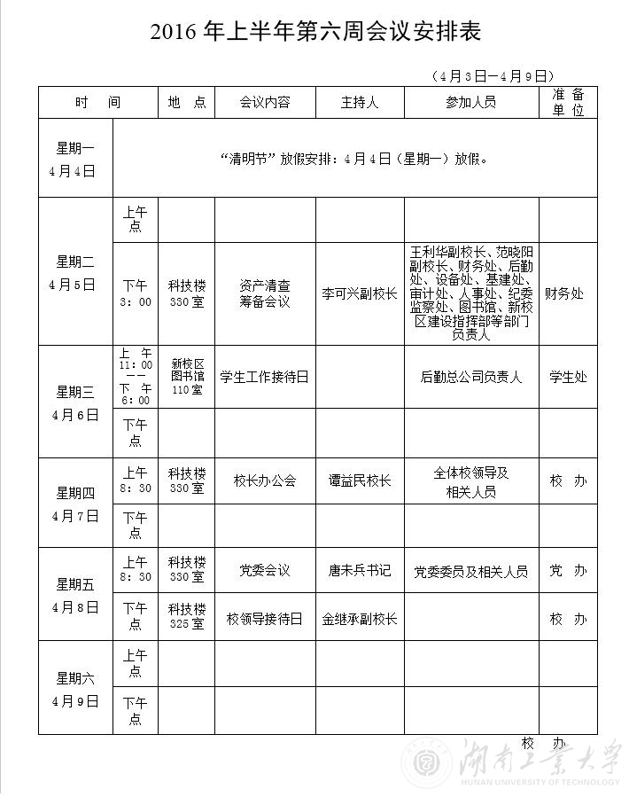 2016年上半年第六周会议安排表