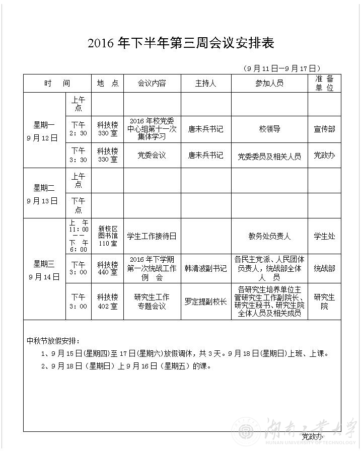 2016年下半年第三周会议安排表
