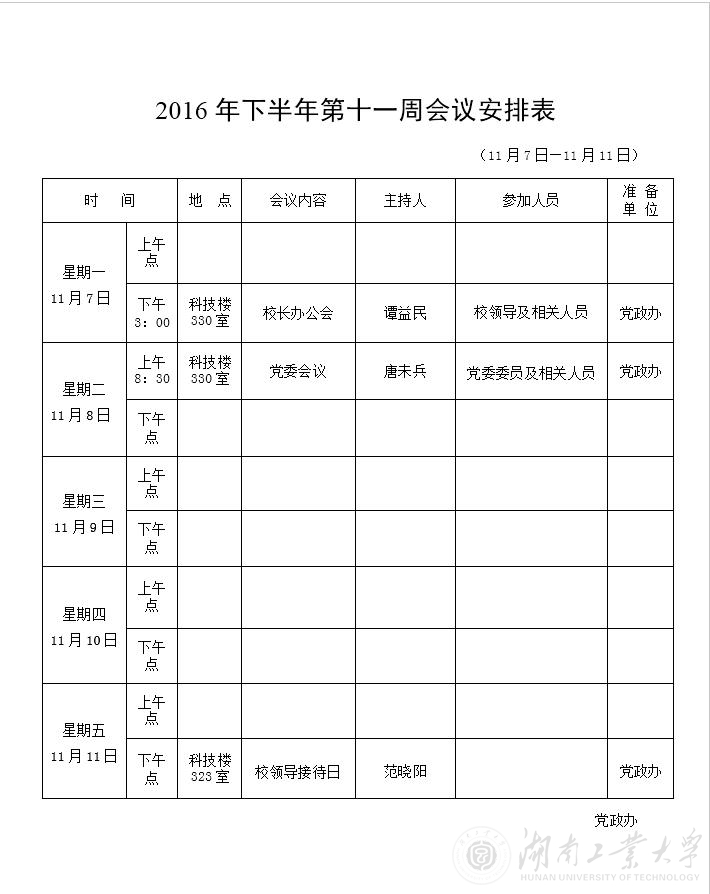 2016年下半年第十一周会议安排表