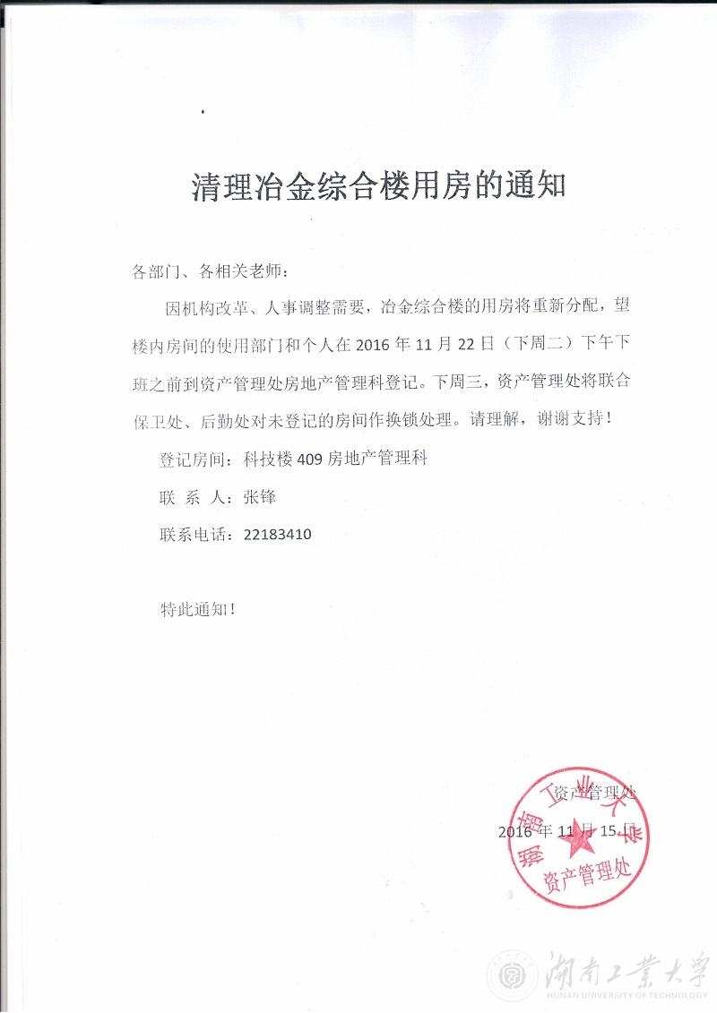 清理冶金综合楼用房的通知
