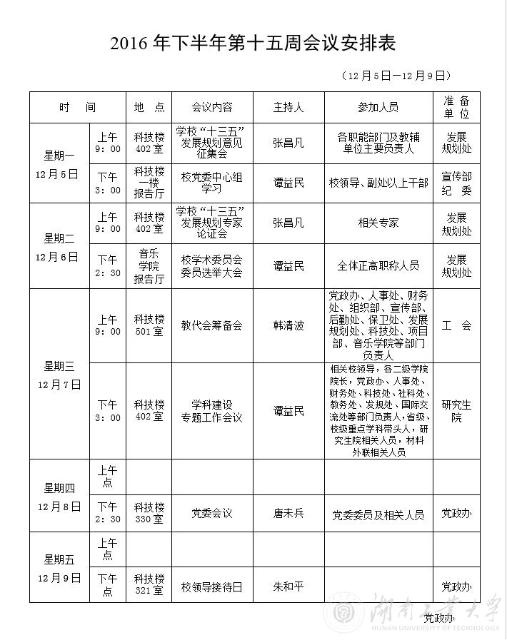 2016年下半年第十五周会议安排表