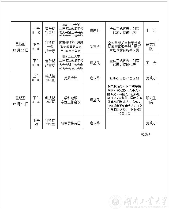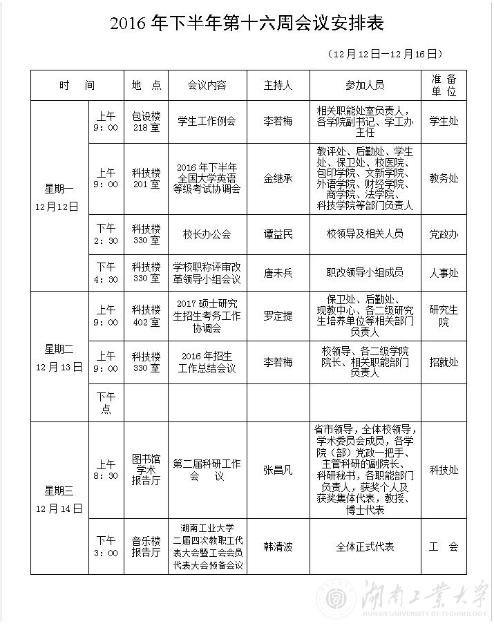 2016年下半年第十六周会议安排表