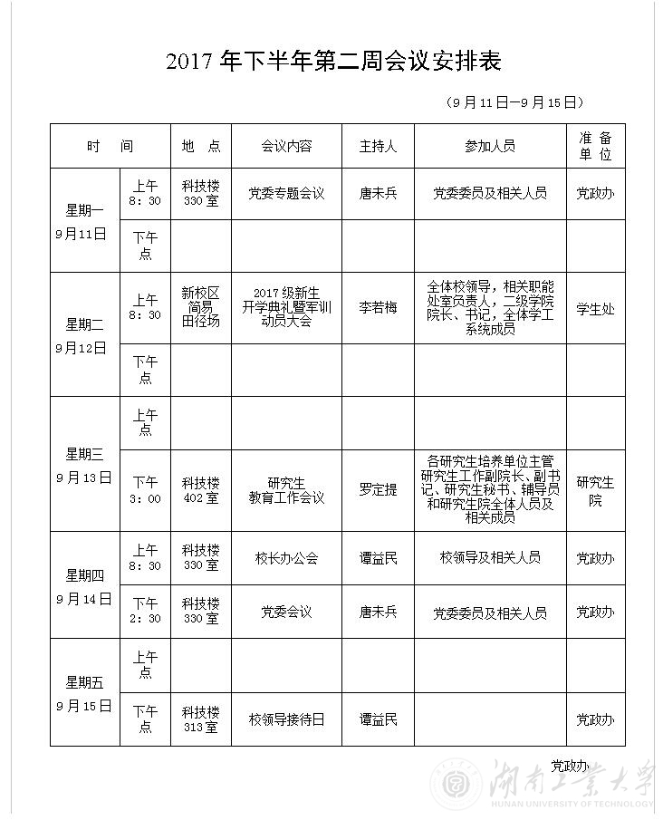 2017年下半年第二周会议安排表