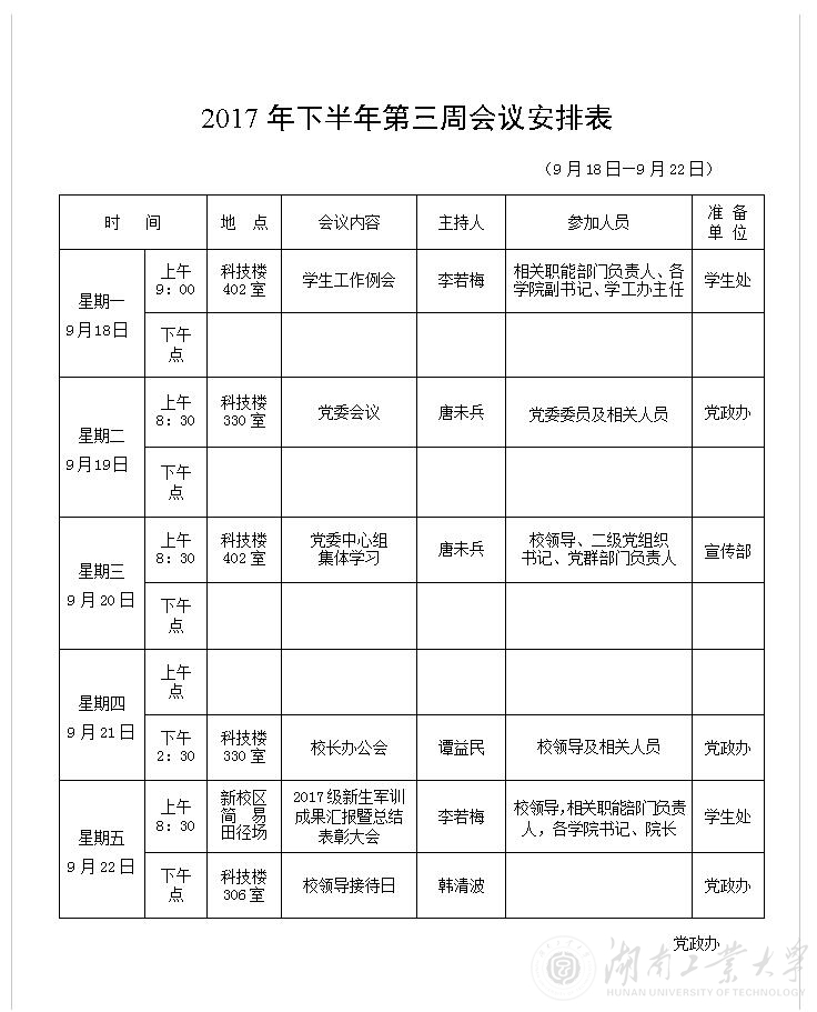 2017年下半年第三周会议安排表
