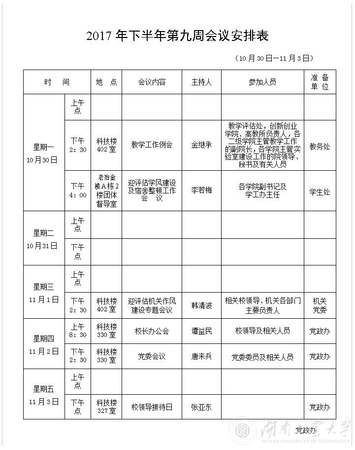 2017年下半年第九周会议安排表