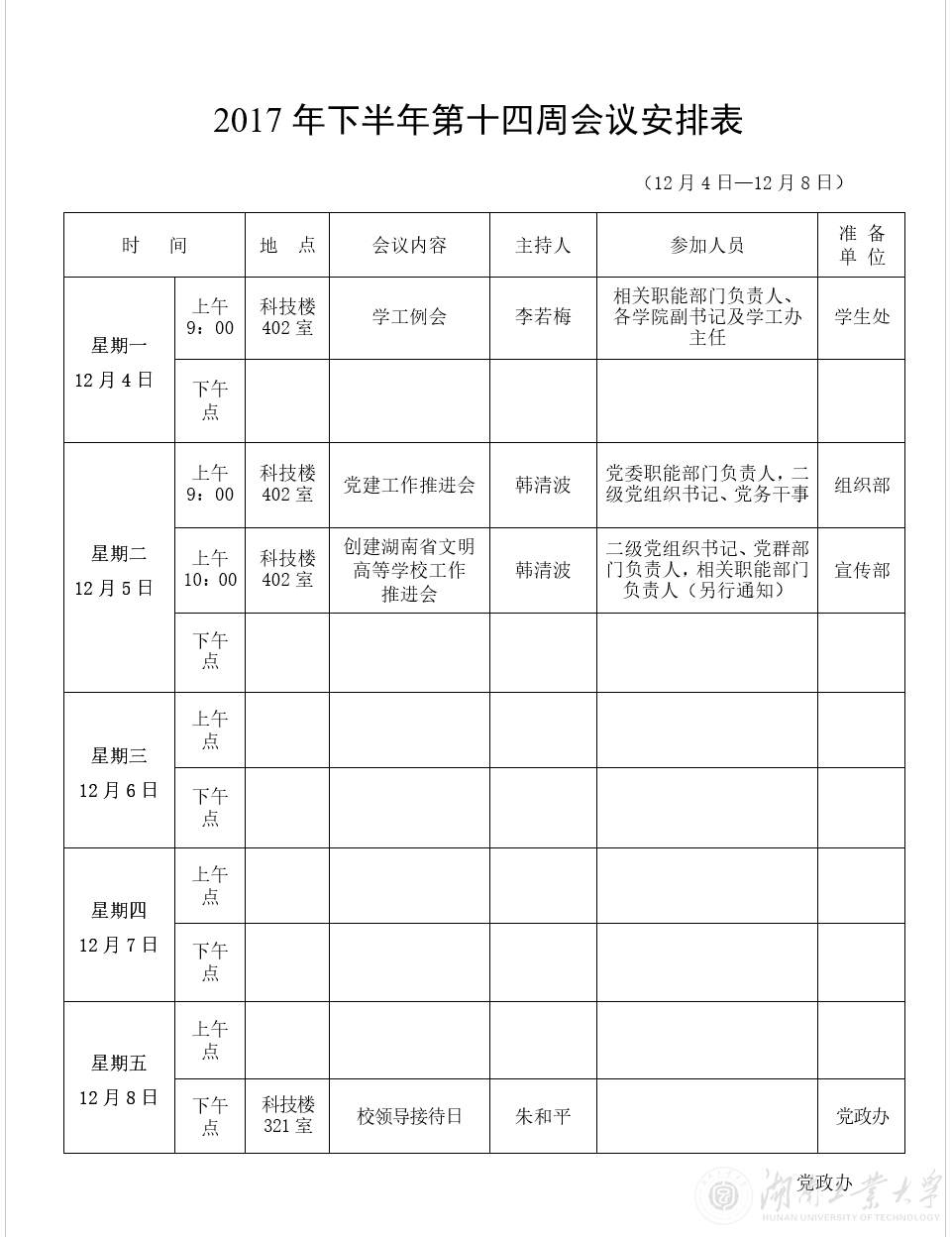 2017年下半年第十四周会议安排表