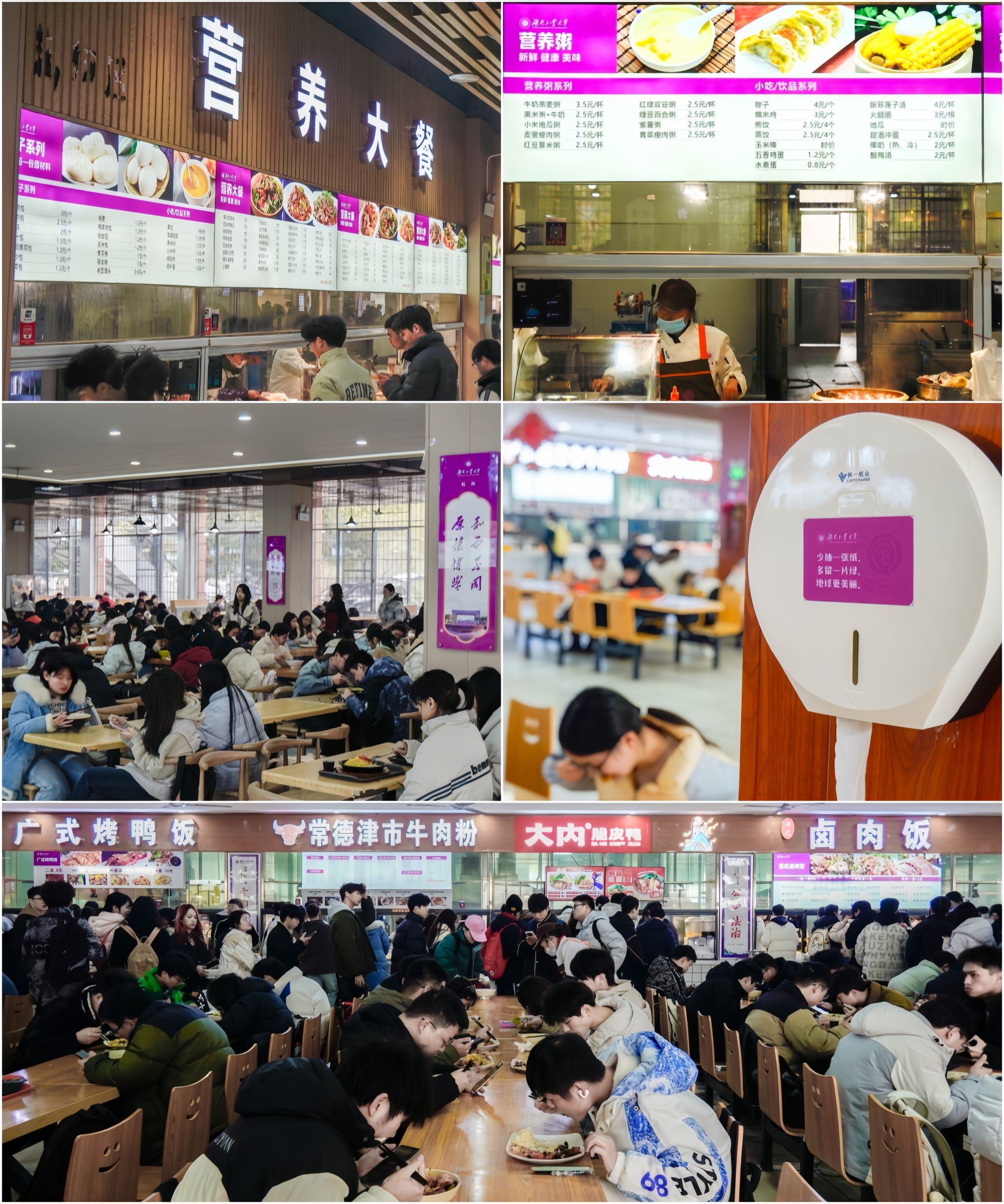 自营之后,东苑食堂始终将服务师生放在首位,严格把控原材料采购,精心优化各项运营流程。在各方努力下,饭菜价格较以往明显下降,同时,师生的就餐率和就餐满意度大幅攀升,真正让师生享受到了良好的就餐体验。不仅如此,东苑食堂还对内饰环境上也进行了升级,巧妙地将校园文化与就餐环境融合,食堂内“工大紫”元素随处可见,极大地提升了师生的归属感和获得感。