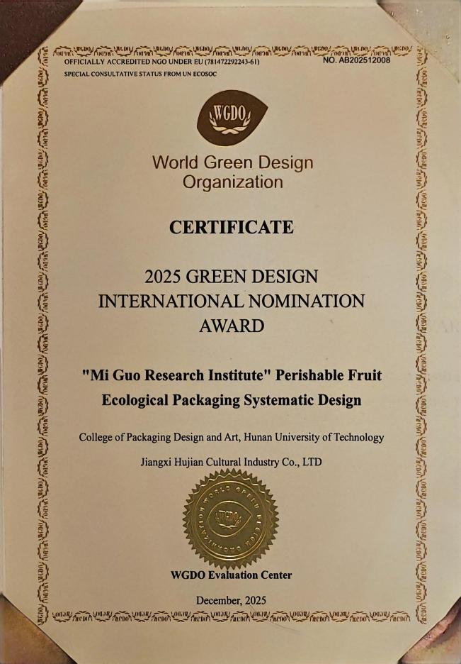 1月21日,“世界绿色设计组织(WGDO)第十五届年会暨布鲁塞尔峰会”在比利时布鲁塞尔举行,会上颁发了“2025年绿色设计国际奖”。德赢刘文良、马雪寒、吴紫瑄团队的设计方案"Mi Guo Research Institute" Perishable Fruit Ecological Packaging Systematic Design荣获绿色设计国际提名奖。该设计由德赢包装设计艺术学院和江西省斛涧文化产业有限公司共同完成,以安全、绿色为导向,从可持续材料、多功能结构、信息可追溯及体验设计等维度展开系统设计,构建了一套兼顾保鲜安全与可持续发展需求的易腐水果包装高效解决方案。年会共收到来自全球43个国家的900余份成果申请,经评审委员会严格筛选和深入评价,共评出13个绿色设计国际大奖,7个绿色设计国际提名奖,3个贡献奖。