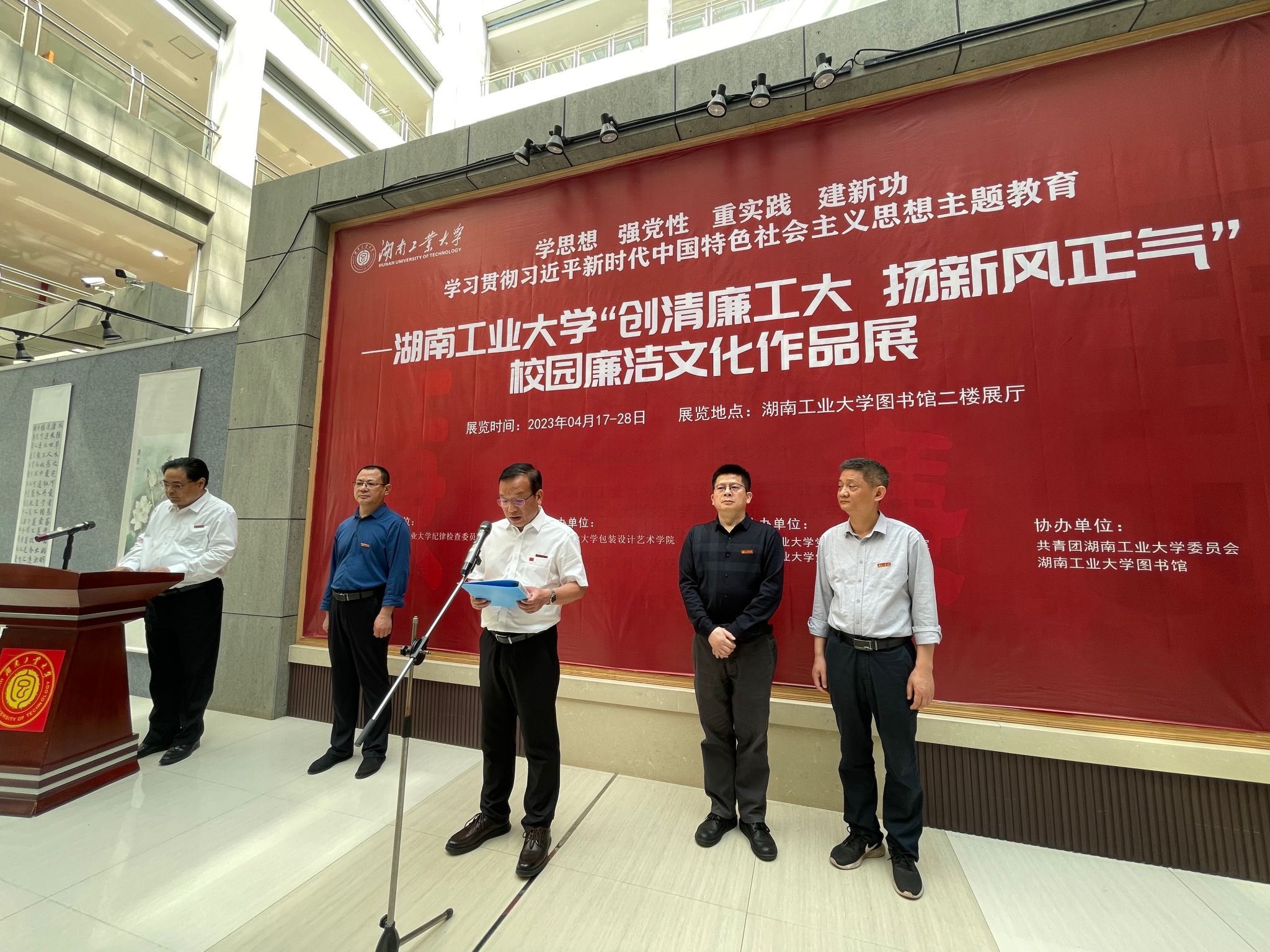 佘朝文代表校党委对此次廉洁文化优秀作品展的开幕表示热烈祝贺,向对本次展览给予大力支持的各二级学院、相关职能部门表示衷心的感谢,并宣布“创清廉工大 扬新风正气”校园廉洁文化优秀作品展开幕。同时,他就本次作品展提出三点意见:一是要提高政治站位,认清新时代廉洁文化建设的重大意义;二是要把握政治方向,涵养风清气正的校园政治生态;三是要坚持思想“育廉厚植 崇廉尚廉”的文化土壤。他希望通过举办此次展览,使广大师生受到廉洁文化的熏陶,增强廉洁自律意识,筑牢拒腐防变的思想道德防线,将感知内化提升为廉政理念,转化为廉洁从政、廉洁从教、廉洁修身、廉洁齐家的自觉行动,持续推动营造干部清正、机关清廉、政治清明、校园清朗的政治生态和发展环境,形成全校崇清尚廉的浓厚氛围,为全面提升"清廉工大"品牌影响力,推动学校高质量发展注入新活力。