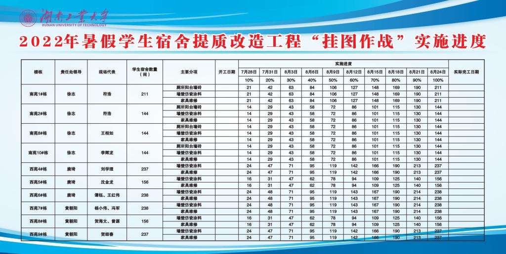 截止8月24号晚上,学生宿舍提质改造工作按计划全面完工。后续,后勤管理处将设置提质改造宿舍售后维修服务站,对学生宿舍未维修到位的问题给予继续提供维修服务,完全解决到位。