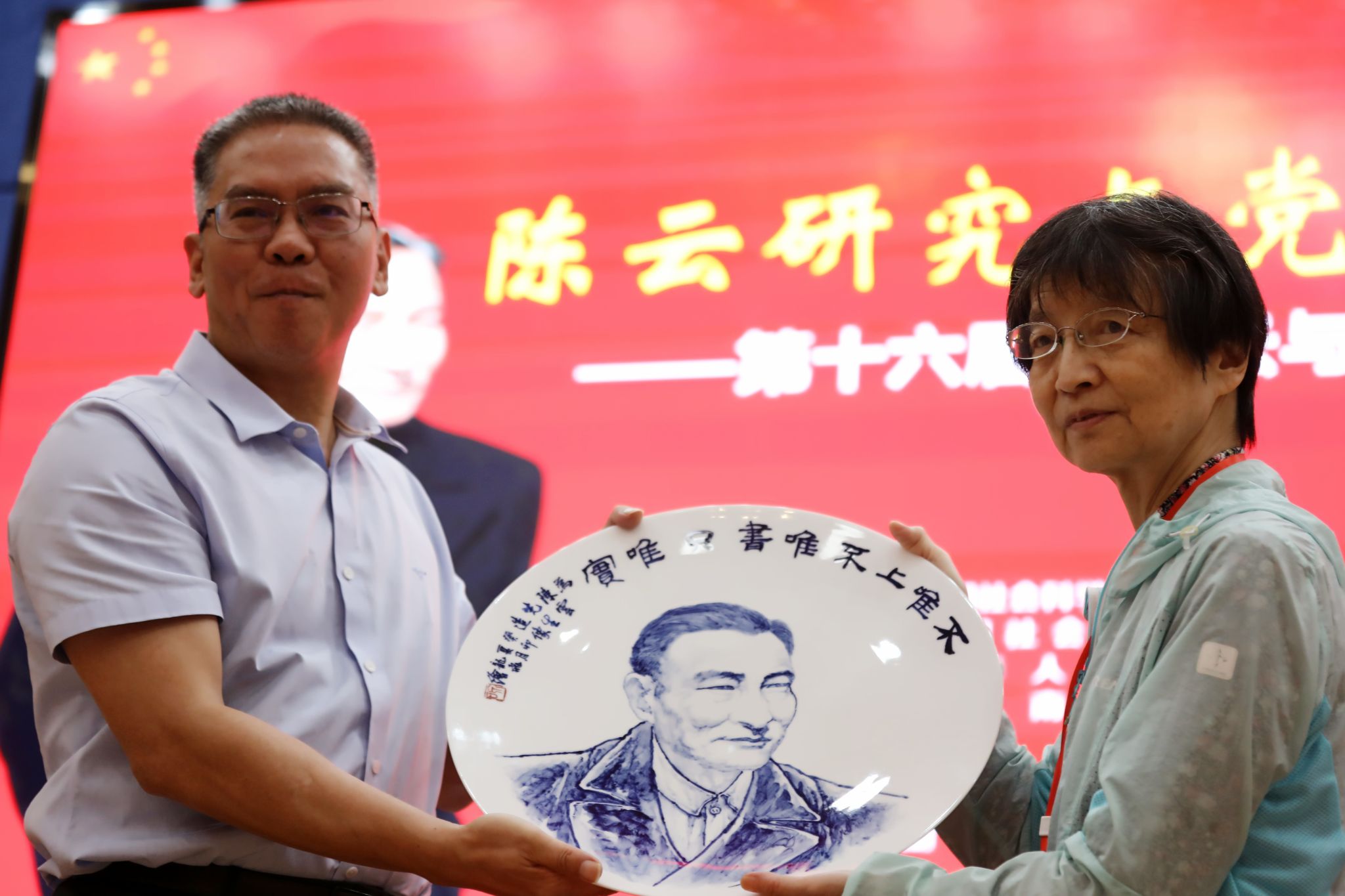曹慧泉代表株洲市委市政府向陈云同志次女陈伟华赠送陶瓷画像