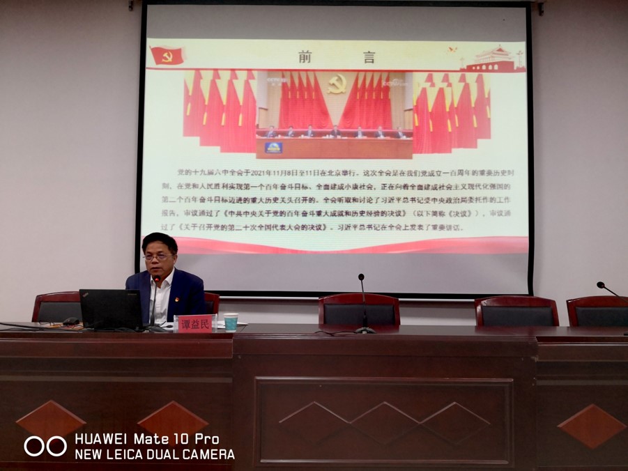 谭益民紧紧围绕学习贯彻党的十九届六中全会精神和全会通过的《决议》,从深刻把握召开党的十九届六中全会、作出新的历史《决议》的重大意义,深刻把握党百年奋斗的初心使命和重大成就,深刻把握中国特色社会主义新时代的历史性成就和历史性变革,深刻把握党百年奋斗的历史意义和历史经验等方面进行了系统阐述和深入解读。