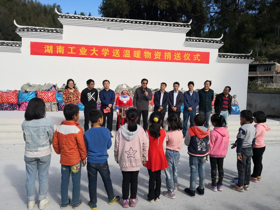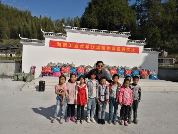 在茶园小学,唐未兵代表学校为茶园村贫困户送来了300套价值6万元的过冬物资,期间与茶园小学部分学生进行了愉快的互动。