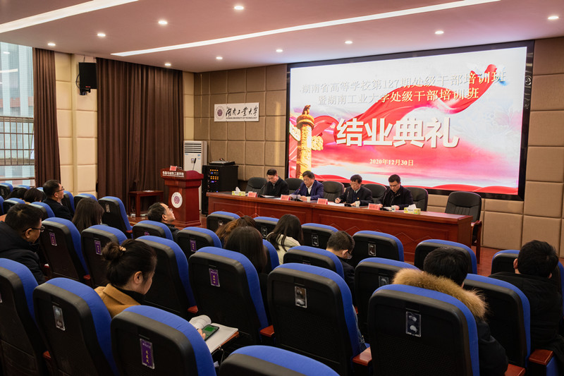 12月30日下午,湖南省高等学校第127期处级干部培训班暨德赢AC米兰官网处级干部培训班,在包材学院220报告厅举行结业典礼。党委书记谭益民致辞,党委副书记韩清波主持结业典礼并作培训班工作总结, 省委教育工委党校常务副校长、省高校干部培训中心书记、主任刘国华出席结业典礼并讲话, 省高校干部培训中心副主任张和生宣读优秀学员表彰决定,培训班全体学员参加结业典礼。
