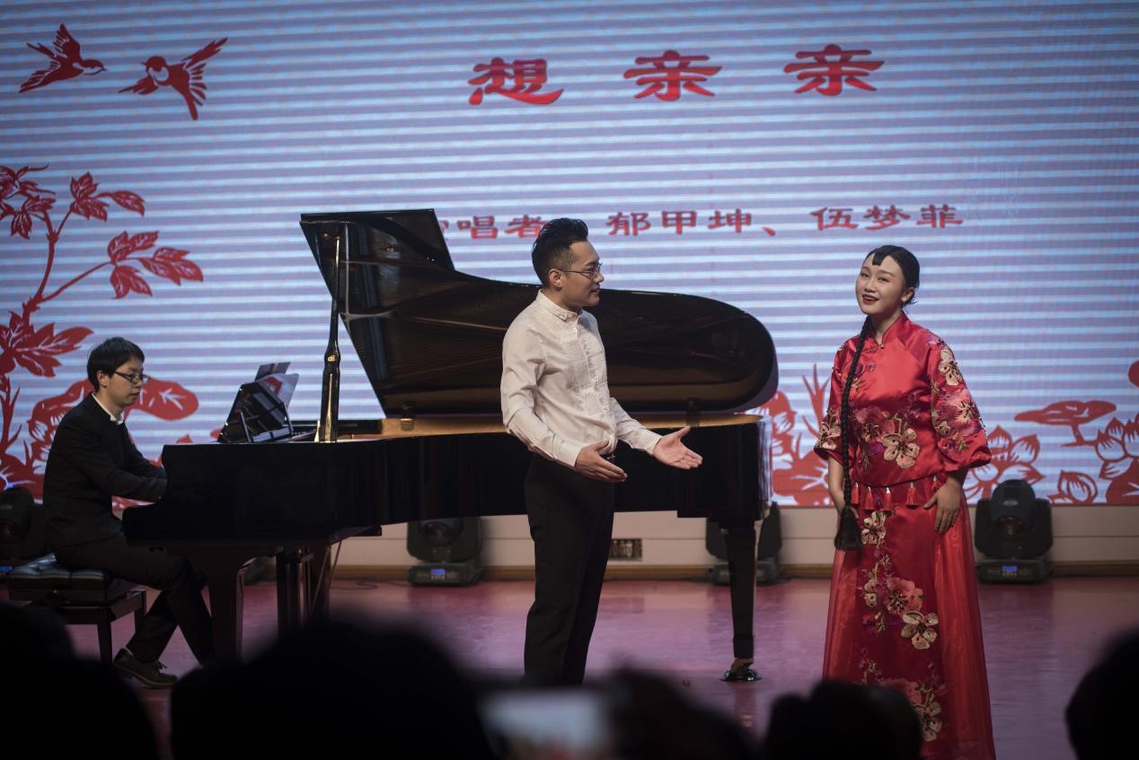 音乐会伊始,李燕老师以一首深情款款的《眺望》拉开整场序幕。第一个小高潮出现在郁甲坤老师和伍梦菲老师合作演唱的山西民歌《想亲亲》,两位老师不仅在动作上进行了精心编排,更从眼神中深情诠释了一对年轻恋人纯洁、热情、温馨的爱恋,赢得全场喝彩。
