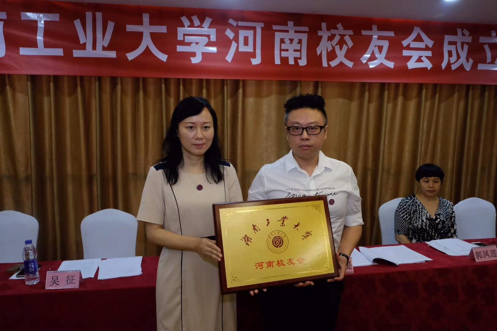 李若梅为河南校友会授牌,学校相关人员为河南校友会理事成员颁发聘书。