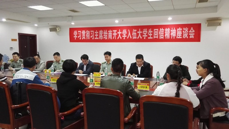 10月13日下午,德赢在科技楼501会议室召开学习贯彻“习近平总书记给南开大学新入伍大学生重要回信精神”座谈会。副校长李可兴,株洲市军分区、天元区人武部、校党委武装部、学生工作部(处)负责人以及学生代表三十余人参加了座谈会。