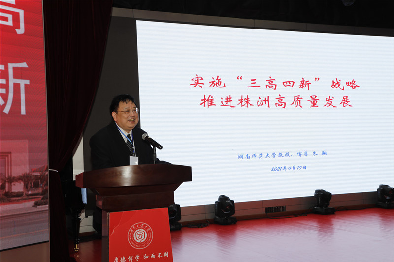 论坛上,朱翔教授以《实施“三高四新”战略推进株洲高质量发展》为题,结合国内外发展模式的分析,紧紧围绕湖南省“十四五”和中长期发展规划纲要,从“十四五”时期经济社会发展的指导思想和必须遵循的原则、“十四五”时期经济社会发展的主要目标谈到长江中下游城市群、长株潭城市群建设,以及习近平总书记关于经济社会发展的一系列战略思想,对我国新时期区域经济发展格局和转型升级进行分析,对湖南省经济社会发展进行多层次的解读,对如何围绕“三高四新”推进株洲市高质量发展进行多角度的阐述。