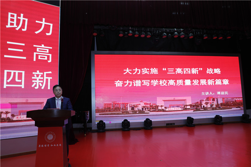 谭益民教授作了题为《大力实施“三高四新”战略,奋力谱写学校高质量发展新篇章》的主旨演讲。他表示,德赢AC米兰官网作为扎根株洲、与株洲工业建设与发展始终同呼吸共命运的唯一一所本科院校,将思想自觉、政治自觉、行动自觉,凝心聚力,真抓实干,力争在湖南“三高四新”战略“八大工程”推进中提供高质量科研成果与关键核心技术开发服务,力争在株洲市“三高四新”战略“一谷三区”建设推进中成为“智力库”与“人才库”,加快建设工业科学融合创新、包装教育特色鲜明的新工大,在实施‘三高四新’战略中展现新作为。