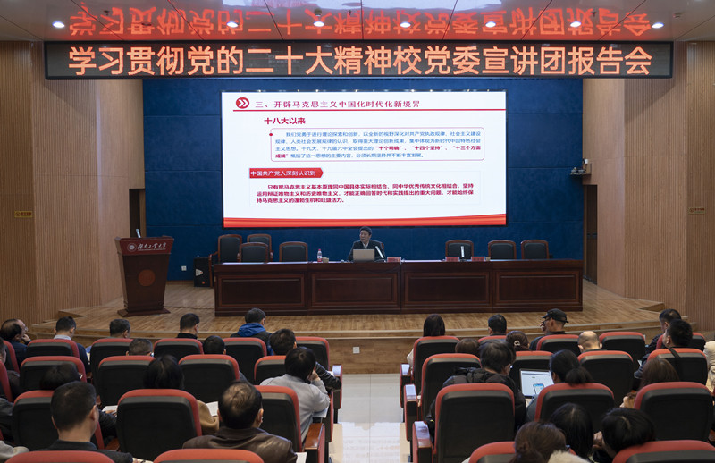 范晓阳以“勠力同心 勇毅前行 奋力开创学校高质量发展新局面”为题,从“党的二十大的主题及主要成果”“过去五年的工作和新时代十年的伟大变革”“开辟马克思主义中国化时代化新境界”“新时代新征程中国共产党的使命任务”“贯彻落实新时代新征程的战略部署”“深入推进新时代党的建设新的伟大工程”“用新的伟大奋斗创造新的伟业”“坚持问题导向,推动学校高质量发展”等八个方面,结合学校工作实际,对党的二十大精神进行了系统深入解读。