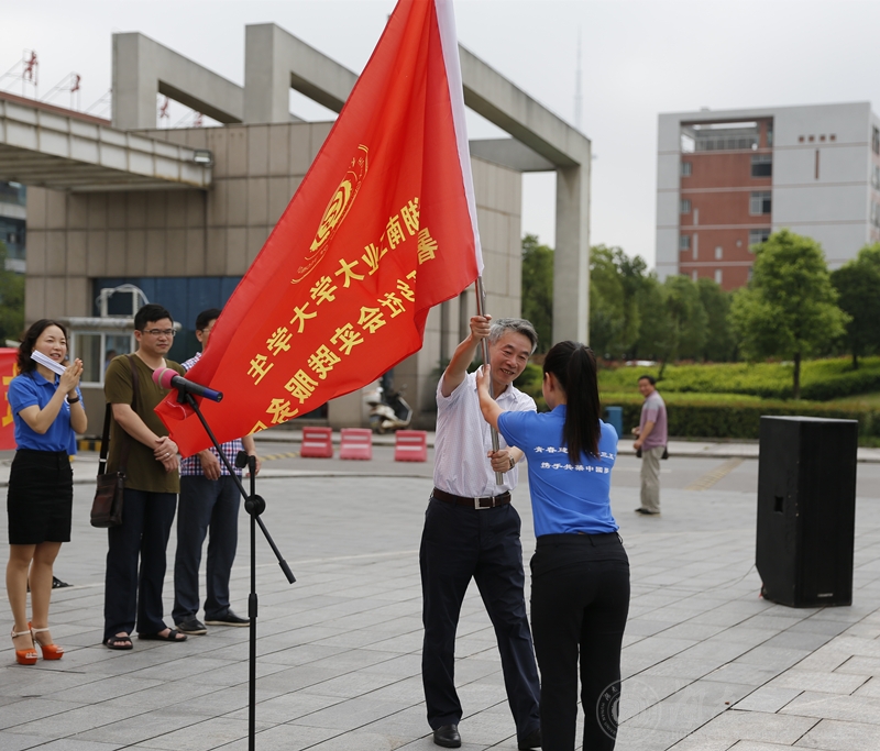 校党委副书记韩清波为“三下乡”志愿者队伍授旗并宣布本次暑期“三下乡”社会实践活动正式启动。
