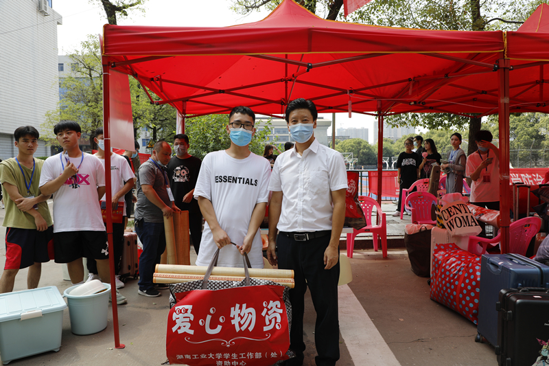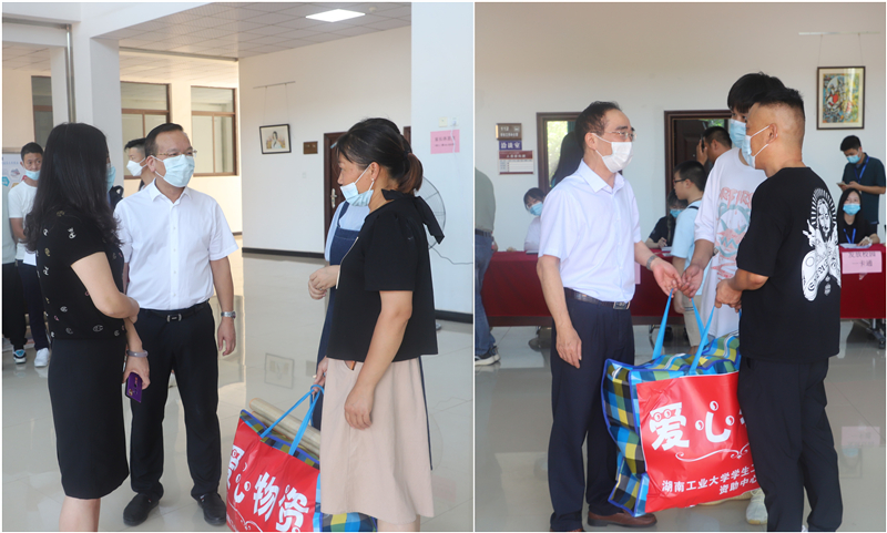 副校长佘朝文、蒋建初在醴陵陶瓷学院为贫困新生赠送爱心物资