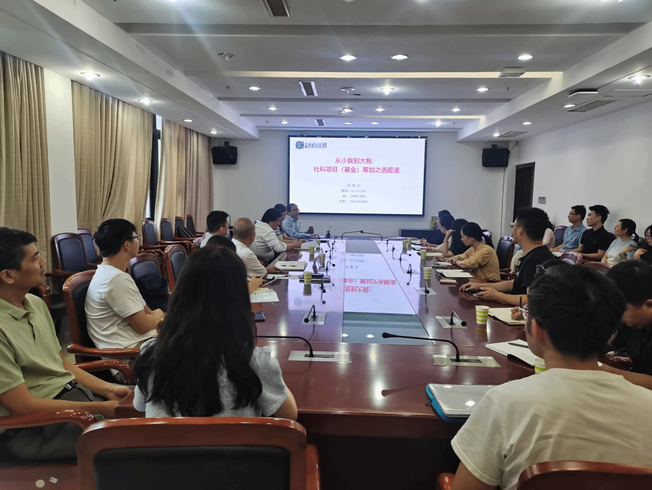 会后,还邀请到长沙理工大学刘建江教授做学术讲座。刘建江以《从小我到大我:社科项目(基金)筹划之道》为题,从平台的重要性、平台与个人的关系、伯乐与千里马的关系等讲解了项目申报事项。他建议,教师们在申报科研项目时要有信心与情怀;要有短期、中期及长期目标;要学会借力和静心。讲座结束后,刘教授与博士们就选题进行了充分交流探讨。