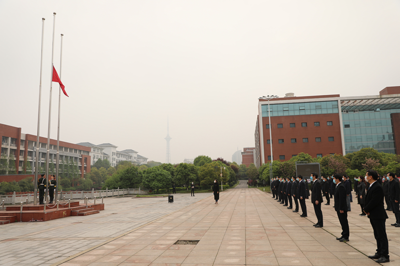 现场气氛庄严肃穆。党委书记谭益民、校长刘扬等神情庄重,面向国旗肃然而立。9点55分,在雄壮的国歌声中,国旗徐徐升起。在举行升旗仪式后,国旗缓缓降至旗杆三分之一处,全体人员肃穆而立,共悼逝者,寄托哀思。10时整,警报长鸣,全体人员双手垂立,低头默哀三分钟。