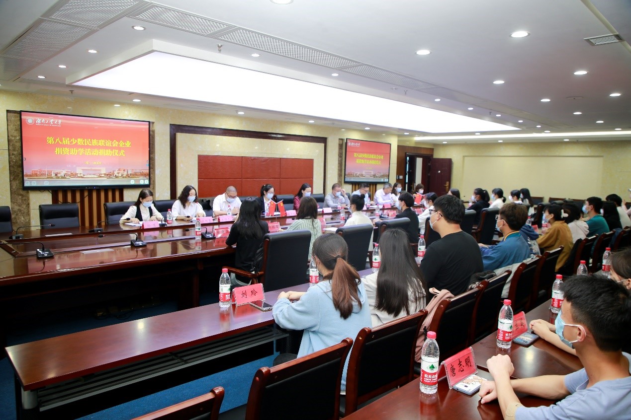 5月24日下午,德赢第八届少数民族企业捐资助学活动顺利开展。株洲市少数民族联谊会秘书长刘兴泉、捐资助学单位代表张富良、覃雪枝、龚红梅,副校长李若梅,党委统战部、校少数民族联谊会、学生工作部等相关部门负责人参加活动。
