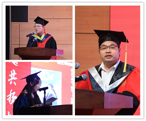 包装材料工程学院张诗浩博士作为优秀博士毕业生代表,生命科学与化学学院青年硕士生导师李广利博士作为导师代表,包装与材料工程学院20级研究生高鹏作为在校研究生代表先后发言。2022届省级优秀毕业生代表,机械学院刘武军同学带领全体毕业研究生宣誓。