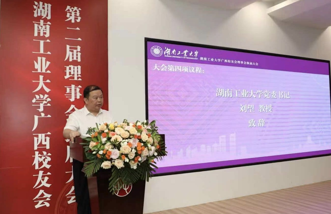 刘望代表学校致辞,他向广西校友致以真诚问候,向广西校友会理事会换届大会如期召开表示热烈祝贺,向为本次换届工作付出辛勤劳动的校友们表示由衷感谢!他向与会校友介绍了学校近年来的发展成果,充分肯定了广西校友会第二届理事会自2018年以来所做的贡献和取得的成绩。并希望第三届理事会继续深化服务理念、时刻关注校友需求、不断夯实组织基础、充分发挥凝聚功能,在学校校友总会的指导下,着力打造好校友的情感精神家园和合作发展平台,为广大校友扎根广西建功立业提供更强助力、实现更大赋能。