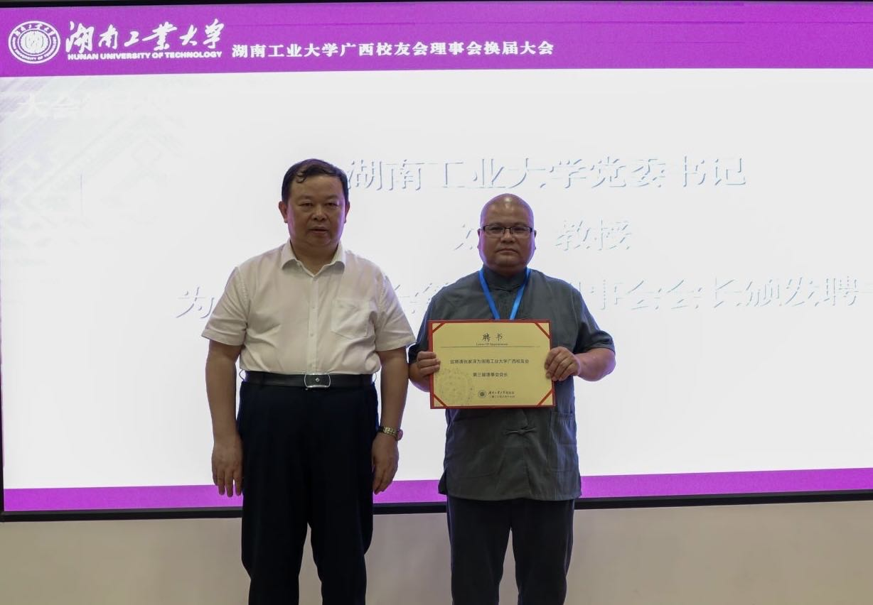 会上,广西校友会第二届理事会会长杨必玖校友向新任会长张家泽校友交接了会牌,向新任秘书长韦继天校友交接了会旗。刘望为新任会长颁发聘书。