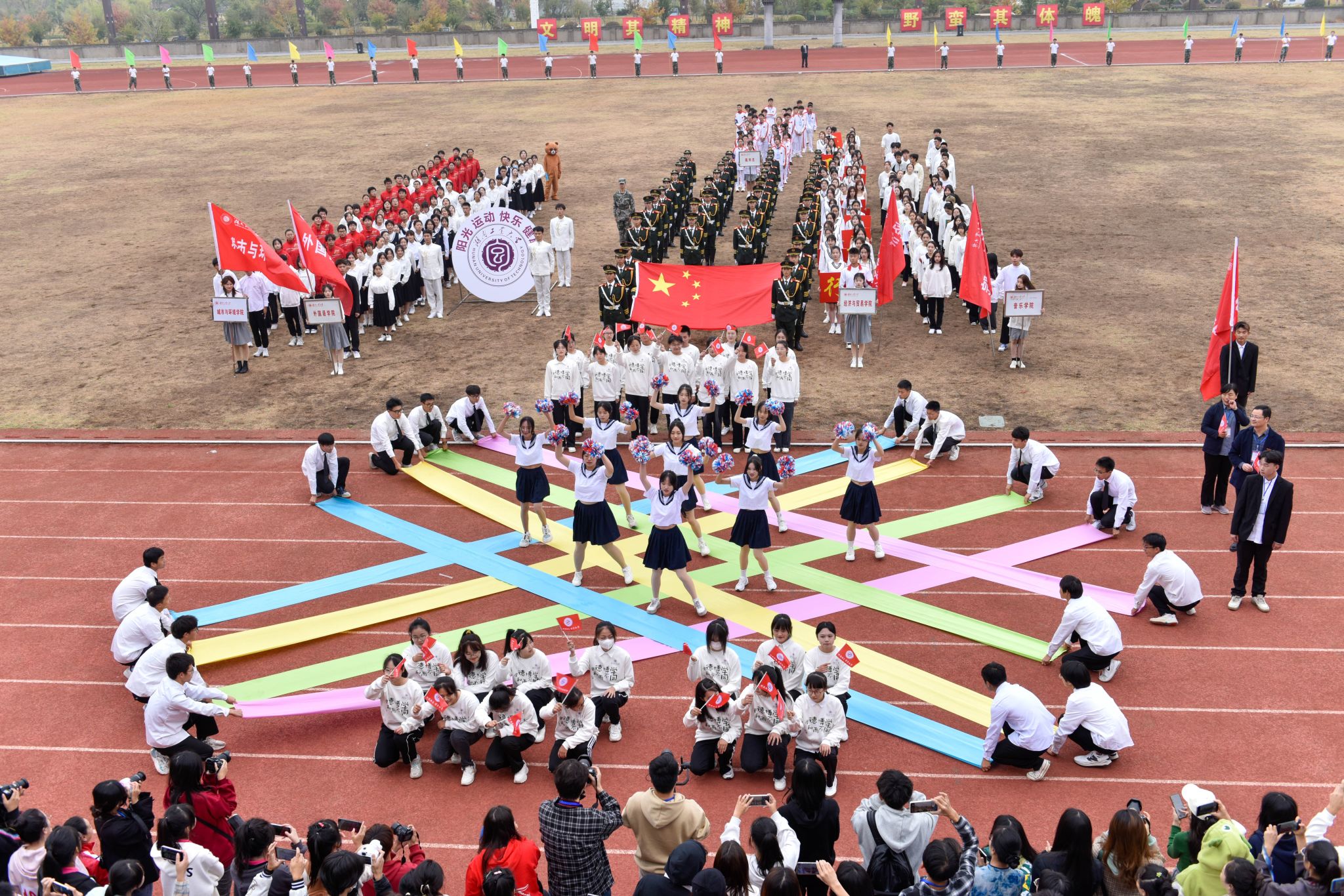 开幕式在“喜庆二十大,奋力新征程”大型表演中拉开帷幕。国旗护卫队、校旗护卫队、彩旗方阵队、裁判员方阵队、教职工代表方阵队、各学院方阵队迈着矫健的步伐依次进场。身着整齐服装的各方阵队精神昂扬地前行,当行进至主席台前时,各方阵队或摆出富有寓意的造型,或喊出嘹亮的口号,将开幕式气氛烘托得热烈喜庆。