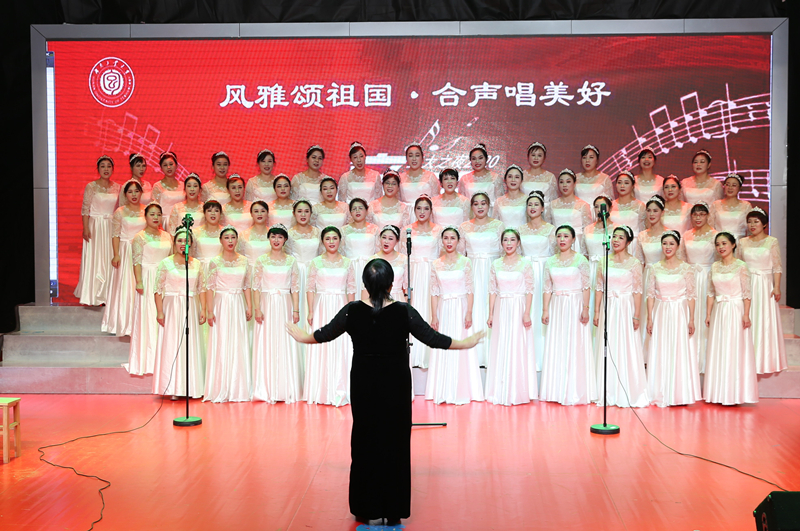 本次活动以快板为始,5名教师手持快板,用欢快的节奏向观众介绍合唱团的成员和由来。合唱《母亲的微笑》正式拉开演出的序幕,教师合唱团身着整齐的白裙,低吟浅唱,讲述了对母亲深深的爱,赞颂了伟大的母亲;教师合唱团的指导老师药彤彤一曲《我的爱人你可听见》,唱出了革命军人对妻子的思念和坚定的理想信念以及对革命胜利的期盼。最后,《不忘初心》和《我和我的祖国》将全场气氛推向最高处,合唱团放声高歌,共祝祖国美好发展。伴着悠扬温情的旋律与热烈融洽的氛围,大家携手站在德赢AC米兰官网这个广阔的舞台上深情祝福我们的祖国母亲,感恩这个伟大的新时代!