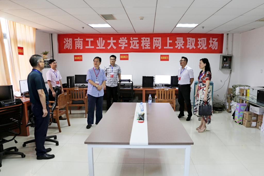 党委书记唐未兵、校长谭益民一行听取了招生与就业指导处负责人关于录取进展情况的汇报,分别查看了录取组长机房、录取组员机房、通知书签发室和现场咨询室等地,详细了解网上录取工作的操作流程。