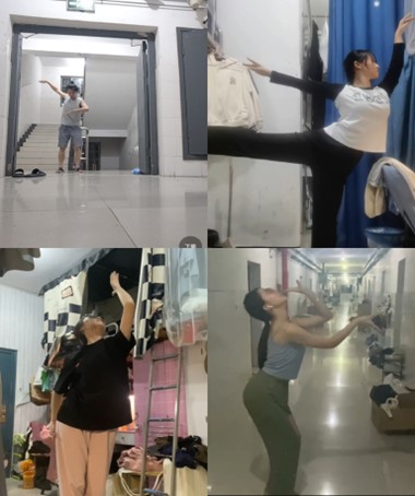 在宿舍中进行线上学习的同学们也克服网络教学中存在的可利用活动空间有限、没有把杆、地板不光滑无弹性等诸多困难,坚持在宿舍、走廊练功、练声、识谱,因疫情而暂时封闭的生活,过得有序而充实。