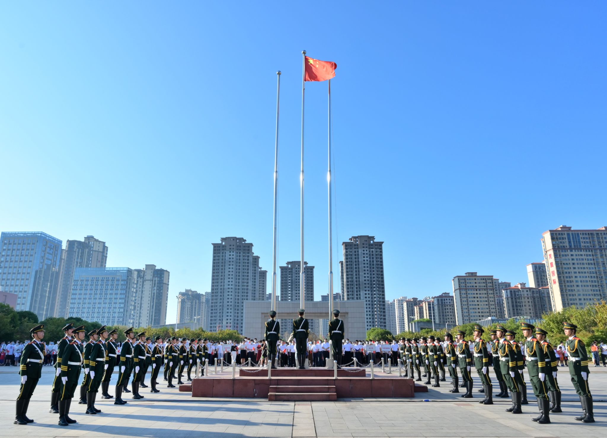 迎着朝阳,校国旗护卫队迈着铿锵有力的步伐,护送鲜艳的五星红旗至升旗台。伴着雄壮的《义勇军进行曲》,五星红旗冉冉升起,全体师生向国旗行注目礼,抒发对祖国的无限热爱和深情祝福。