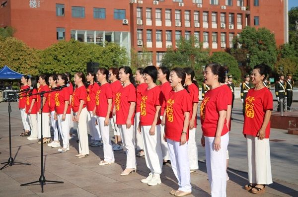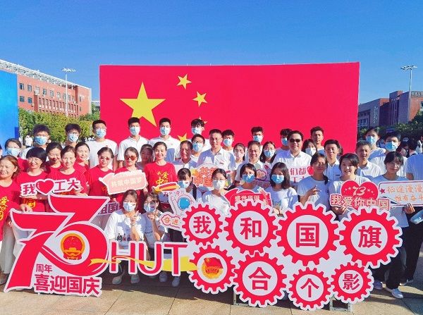 仪式最后,由关工委合唱团带领师生合唱《我和我的祖国》,师生手中的五星红旗伴随着音乐挥舞,广场上漾起红色的波浪,工大师生以洪亮的歌声,表达对祖国最真挚、清澈的爱。