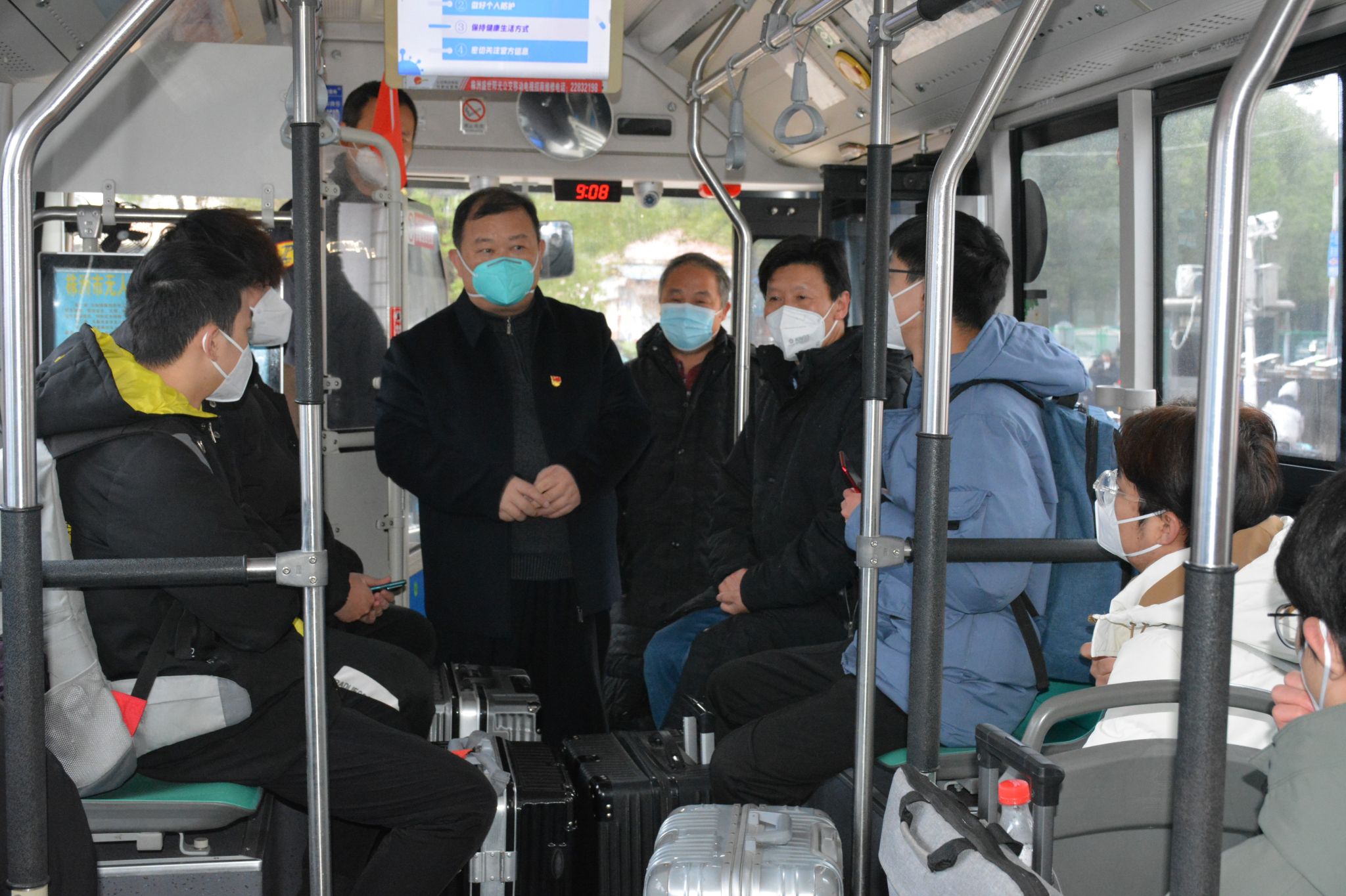在科技学院东门,刘望登上学院租赁送学生的公交车上,询问学生冷不冷?家住哪?怎么回?学习是怎么安排的?得到学生满意答复后,他勉励大家一路上要做好个人防护,平安返家。