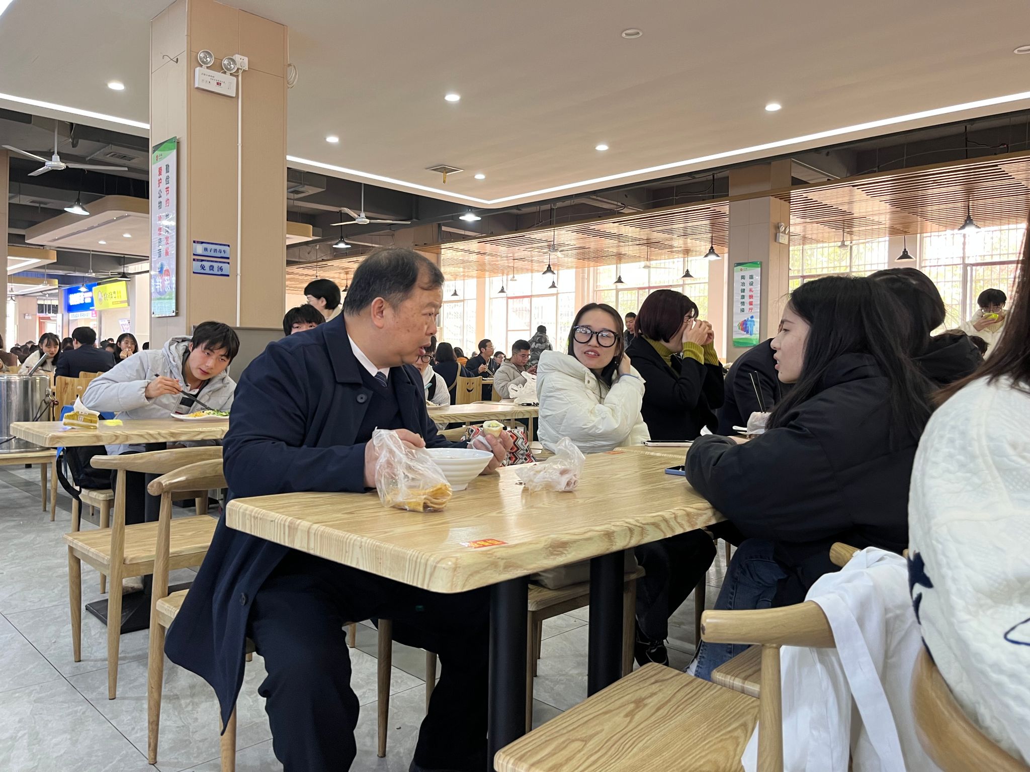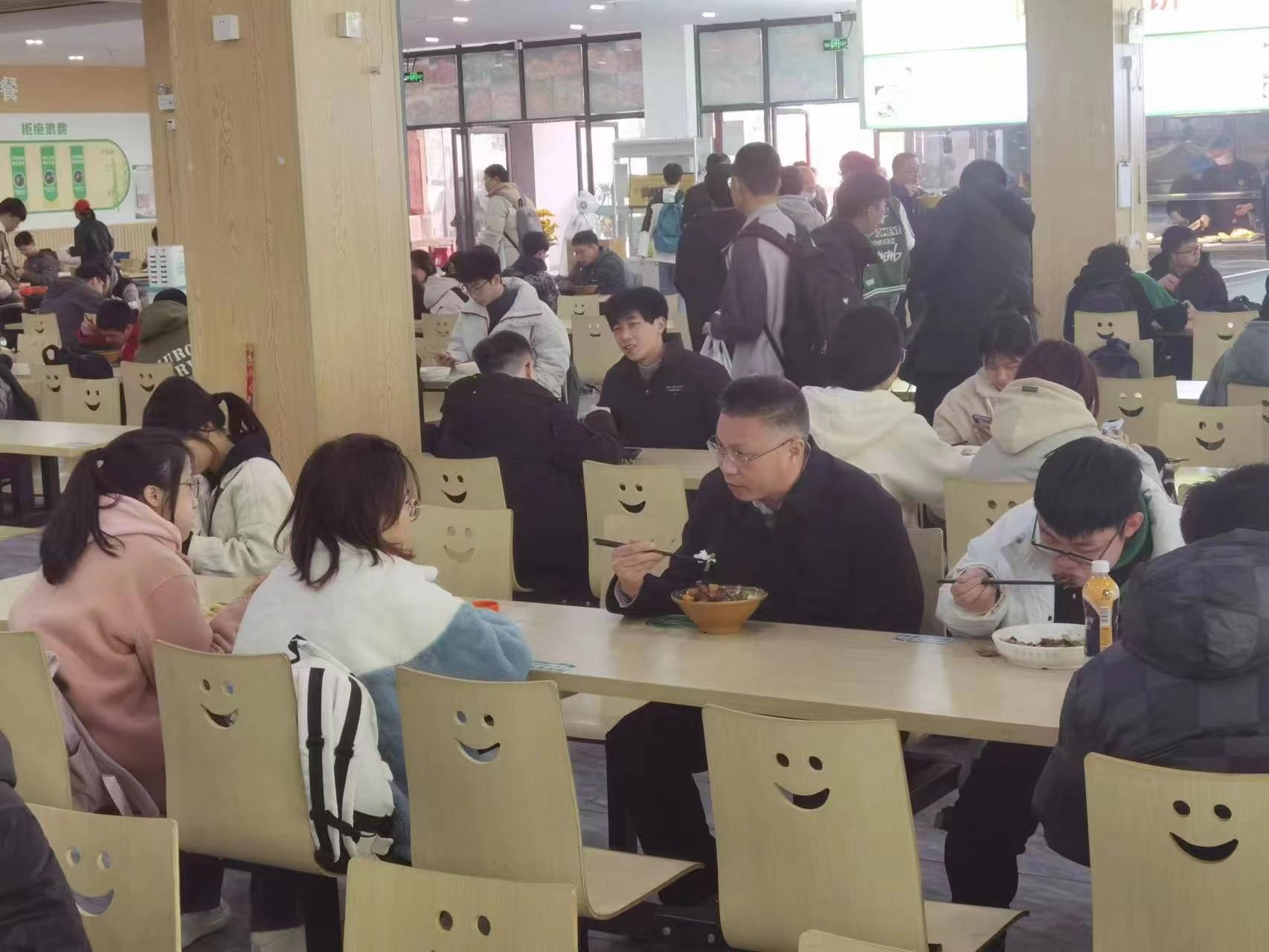 “你是哪里人啊?”“食堂饭菜合不合你的胃口?”“食堂饭菜贵不贵?”“新学期有什么打算?”……校领导与同学们一起排队打饭,在餐桌上与同学们亲切交谈,详细询问大家假期生活以及来校后的学习、住宿和饮食等情况。同学们也放下了平日的拘谨,倾诉自己学习中的体会、生活上的建议以及思想上的困惑。