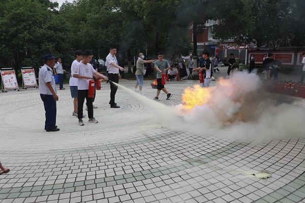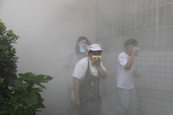 在火灾应急疏散演练和救援演练环节,学校师生按照应急避险和安全疏散要求,用折好三折的毛巾捂住鼻子,在浓烟中有序撤离食堂三楼,来到户外安全区域。在同心湖广场,保卫处工作人员介绍了灭火器的使用环境、使用方法并现场操作。按照“一提、二拔、三握、四压”的方法,在场的师生纷纷进行了灭火器灭火的现场操作。