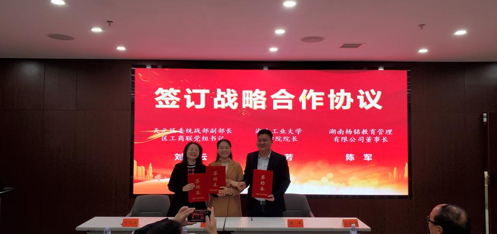 商学院负责人代表商学院与株洲市天元区工商联、湖南杨铭教育管理有限公司签订战略合作协议;佘朝文、石强、袁哲明共同为产学研基地揭牌。