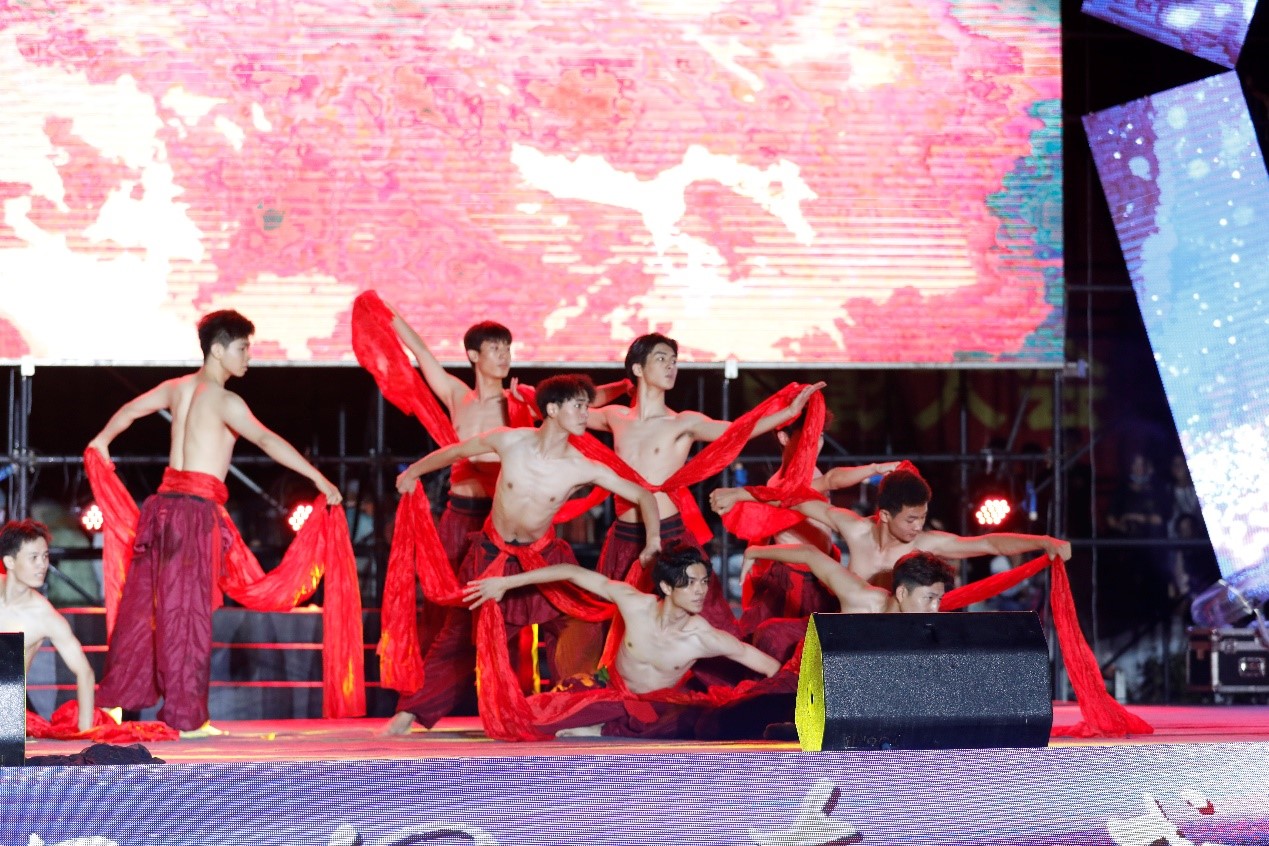晚会节目分“百年征程 波澜壮阔谱华章”“共赴山海 星光相映启新篇”“青春礼赞 奋楫扬帆逐梦想”三个篇章展开。激情澎湃的开场舞蹈《鸿.途》拉开了整场晚会的序幕。舞蹈《东方红》致敬经典,随着音乐的激昂旋律,舞蹈演员整齐划一地挥舞红色飘带,翩翩起舞,令人热血沸腾;诗音画 《半条被子一条心》,用沙画的形式讲述了半条被子的故事,让现场观众感受到了红色教育的洗礼;歌伴舞《无名花》将防疫志愿者们同心戮力、共同抗疫的精神演绎得淋漓尽致;30余位身着各色服装的少年演绎武术《少年志》,太极拳、太极剑、散打、长棍……一招一式尽显英气,充分展示了中华优秀传统文化的博大精深;晚会特邀中国非物质文化遗产口技传人张逵,带来神奇的口技表演,各种声音绘声绘色,变化无穷,让人惊叹;健美操表演《舞动青春》活力四射,激情洋溢,展现了当代大学生的青春风采。晚会现场高潮迭起、精彩纷呈,充满欢声笑语,洋溢着喜庆欢腾的气氛。